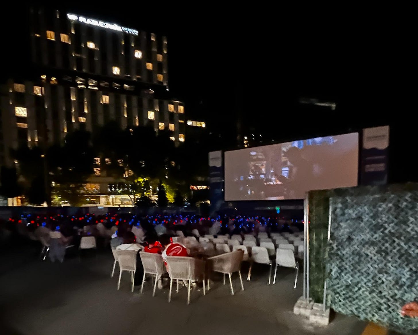 Next thing I see is a giant movie screen showing the new Superman movie and a hundred patrons all wearing the same headphones with blinking blue and red lights on the sides sitting in rows. Tall hotels and historic buildings line the skyline, all blinking lights seemingly in pattern with the movie. It was surreal and I almost couldn’t believe my eyes. Was this really happening? Am I the luckiest man on earth right now? Things I ponder as I make my way to the cervecería tent to quench my thirst.