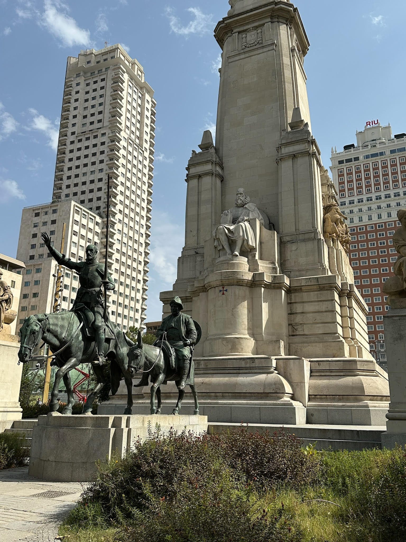 Jim wanted to find the statue of the author Cervantes and his fictional characters Don Quixote and Sancho Panza. So we strolled to Plaza de España where the famous writer and his pair of crazy heroes were immortalized.