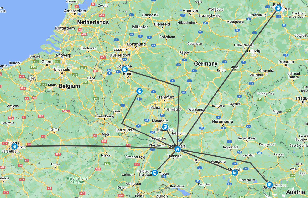 The answer we discovered was this: rent an apartment or condo in a central location within your chosen country/area (the “hub”) and use the excellent train systems in Europe for periodic excursions (the “spokes”). The trains are generally so fast, and the distances so short (compared to the US), that you can take day trips all over the place in two weeks or a month and still have plenty of time to explore the hub city.