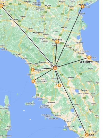 The hub-and-spoke map seen above is an actual trip The Vacationeers took to Italy in 2023. In two weeks, we were able to take eight excursions to some of the most interesting destinations in the country. We’d wake up early, walk to the train station, have breakfast while barreling down the tracks and enjoying the countryside. The longest trip was only about 2-1/2 hours, so there was plenty of time to explore and take in each destination. For the return trip in the early evening, we’d typically share a bottle of wine and a snack we’d bought at a local market, usually including cheese of some sort, all while the bullet train whisked us back to our beds. Then we arrive “home” in the evening to relax and retell stories of our day.